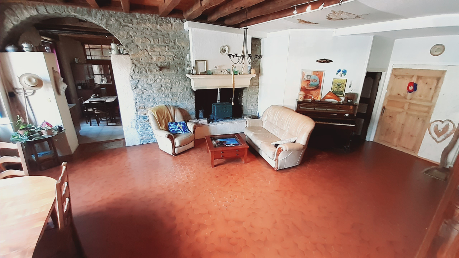 Elle se compose au rez-de-chausée, d'une entrée, une chaufferie/buanderie, un cellier donnant également accès au combles. Une cuisine aménagée donnant accès à la grande pièce de vie. Une salle de bains avec WC, une grande chambre et deux pièces servant de bucher et de dépendances.A l'étage, une couloir donnant accès à trois chambres dont deux avec un accès sur une petite terrasse, ainsi qu'un wc individuel et une salle de bains. Le tout avec un grand grenier à exploiter.